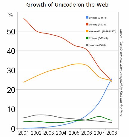 UTF-8 (UCS Transformation Format 8-bit[1]) is a variable-width encoding that can represent every character in the Unicode character set. It was designed for backward compatibility with ASCII and to avoid the complications of endianness and byte order marks in UTF-16 and UTF-32. UTF-8 has become the dominant character encoding for the World-Wide Web, accounting for more than half of all Web pages.