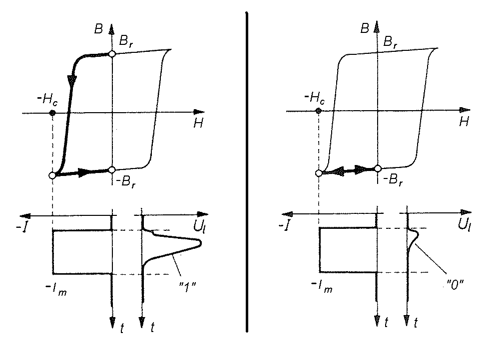 -------------------------------------------------------------------------------- Diagram of the hysteresis curve for a magnetic memory core during a read operation. Sense line current pulse is high ("1") or low ("0") depending on original magnetization state of the core.