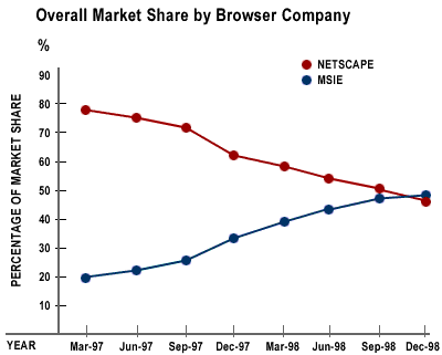------------------------------------------------------------------------- Microsoft Explorer vs. Netsacape Navigator - First browser war ------------------------------------------------------------------------- A browser war is competition for dominance in the browser usage share. The battle between Netscape and Internet Explorer is known as the first browser war. For most of the early history of the WWW, Netscape was the most important browser. Around September 1998 Internet Explorer overtook Netscape as the most used browser.